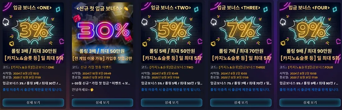 - 5% 보너스: 최소 30,000 KRW의 금액을 입금하고 최대 500,000 KRW의 5% 보상을 활성화하세요. 동일한 인센티브는 동일한 조건으로 7%, 9%, 10% 보너스로 제공될 수 있습니다.